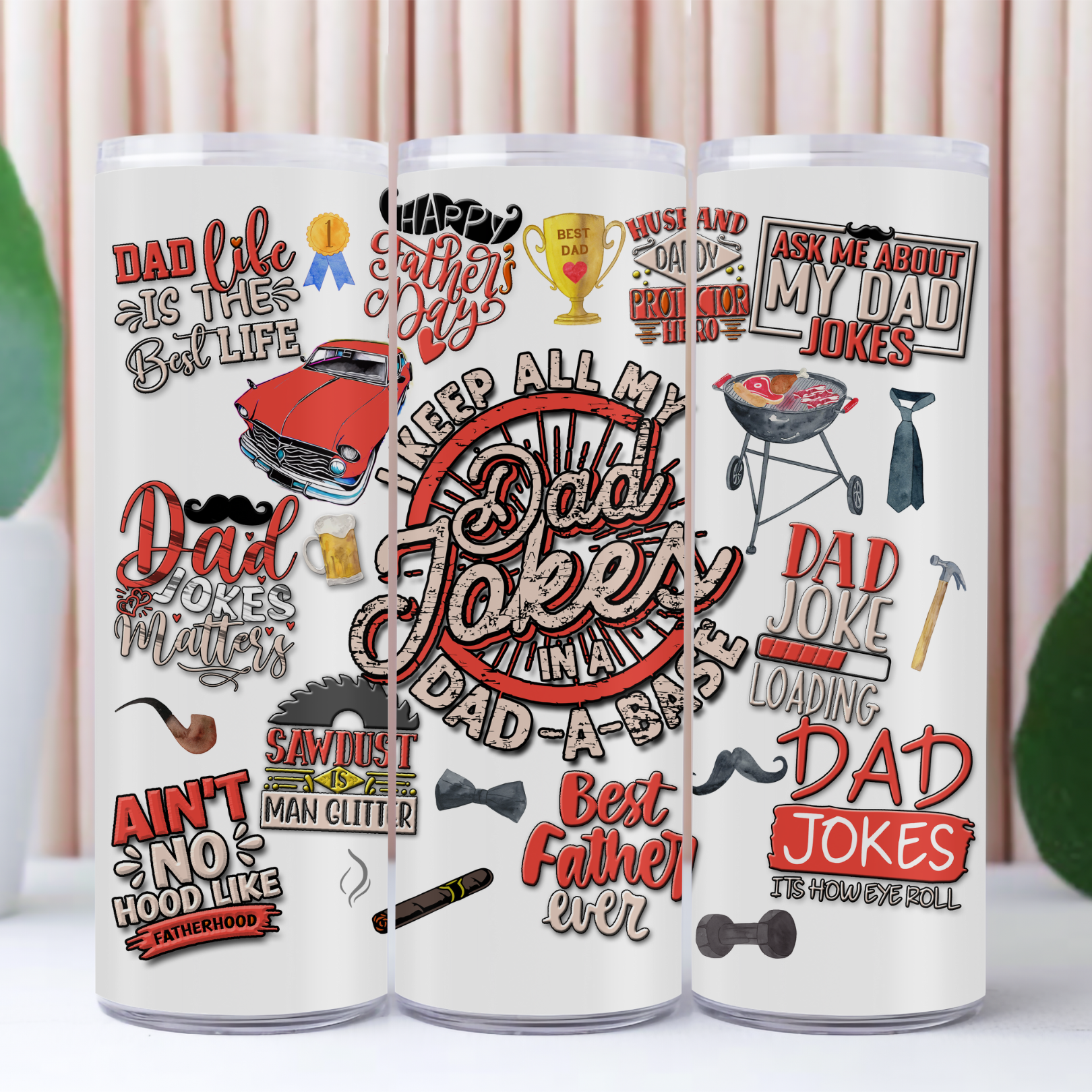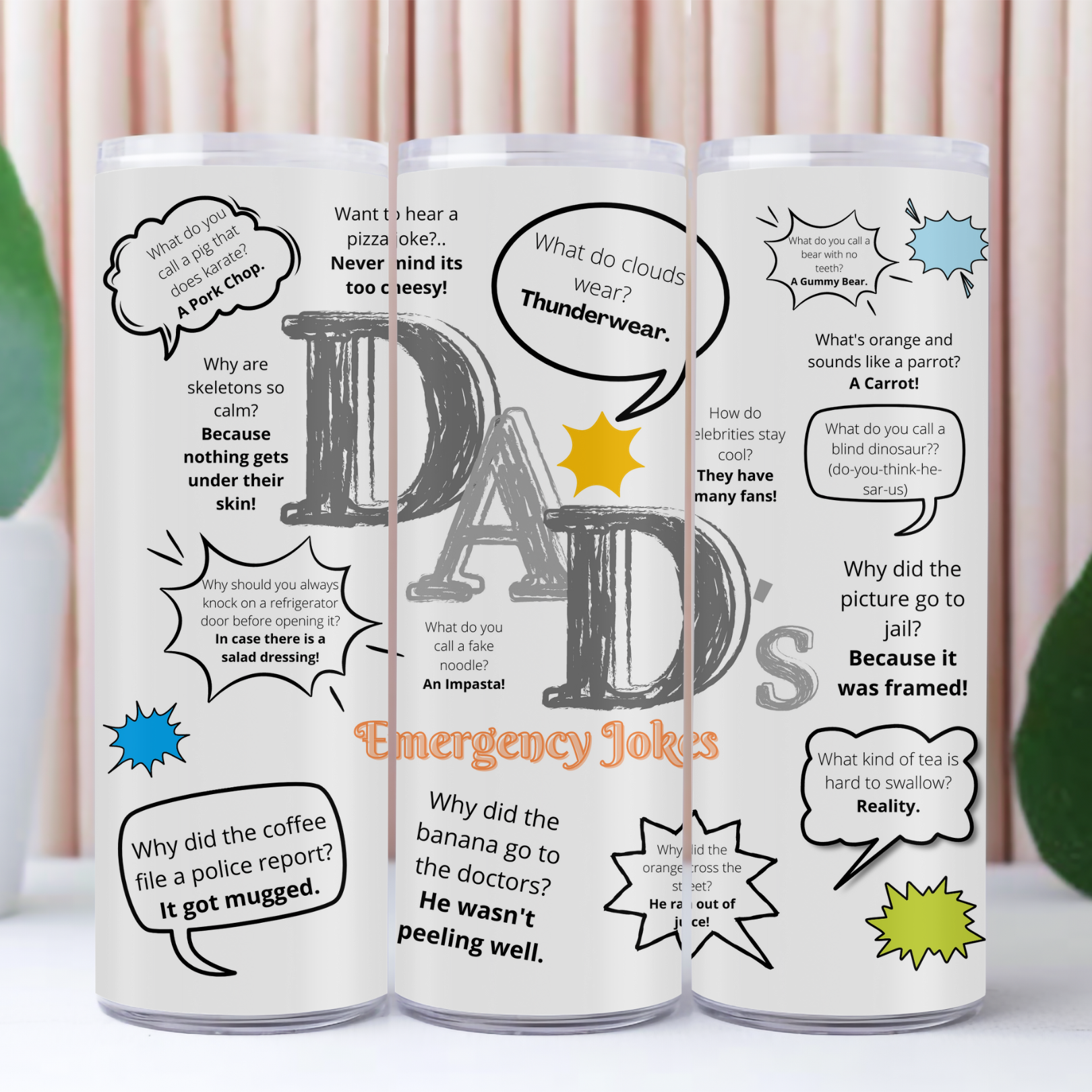 Keep your drink cold—and your jokes even cooler! Our Dad Jokes Tumblers blend everyday function with dad-level humor, featuring classic, eye-roll-worthy one-liners that only a true dad can deliver. Whether you’re at the braai, on the go, or stuck at your desk, this tumbler brings the laughs while keeping your drink at the perfect temperature.